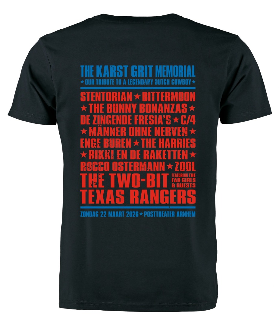 Op zondag 22 maart 2026 vond in het Posttheater in Arnhem The Karst Grit Memorial plaats: een groot popfestival ter ere van Karst Grit. Karst was filmmaker en creatief producent. Maar in de Arnhemse muziekscene was hij vooral bekend als zanger en entertainer van de geliefde countryfeestband Fabulous Grit & The Two-Bit Texas Rangers. Er is nog een beperkte voorraad van het bijbehorende festivalshirt beschikbaar. Bestel 'm hier en bepaal zelf of je 'm thuis laat sturen of komt ophalen.